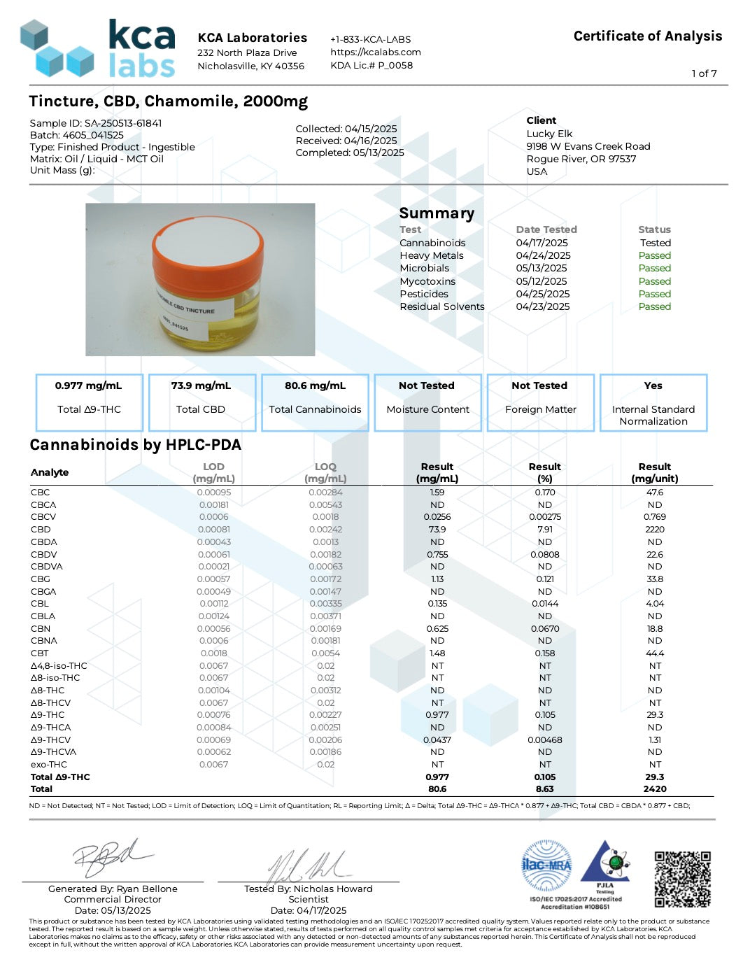 At Lucky Elk, our “tinctures” contain no ethanol whatsoever. That’s why we call them “CBD Drops” instead. The solvents have been completely removed from the CBD distillate—leaving behind only the plant’s full-spectrum of cannabinoids, along with a relatively small amount of natural terpenes and lipids. By mixing this potent brew with MCT oil, our laboratory partners dilute the overall percentage of THC to a non-psychoactive level—leaving our customers with a safe, legal, and highly effective method for self-care.
