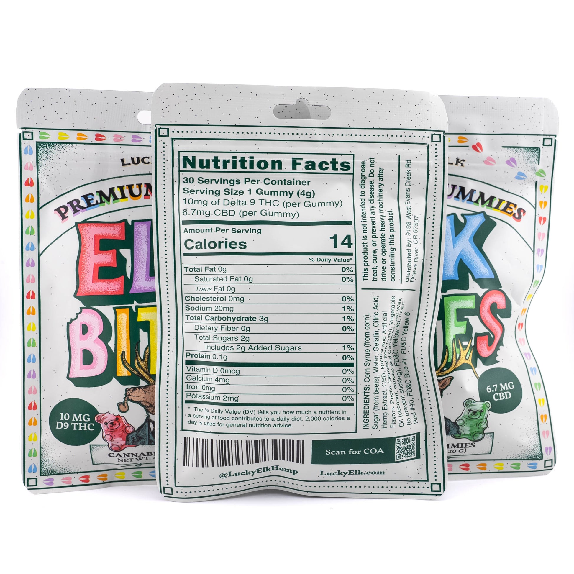 With 30 gummies per package, Elk Bites deliver a total of 300mg Delta-9 THC and 200mg CBD in each bag, perfect for those looking to enjoy controlled, consistent doses. These bite-sized treats are crafted with high-quality ingredients to ensure a great-tasting and enjoyable experience every time. Elk Bites are ideal for unwinding, enhancing your mood, or simply enjoying a balanced cannabinoid experience.