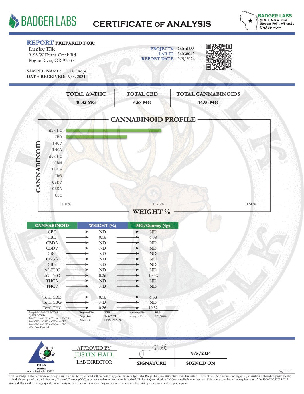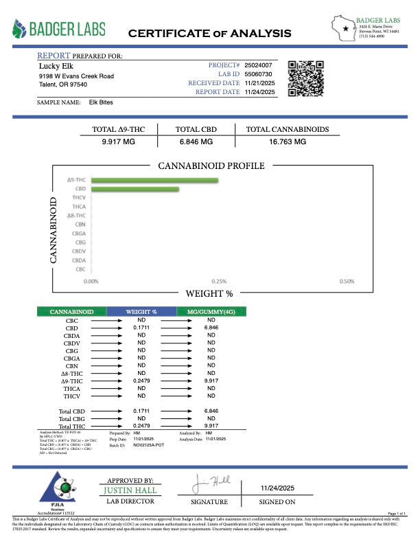 Introducing Elk Bites—our everyday cannabis gummies designed for a perfectly balanced experience. Each gummy contains 10mg of Delta-9 THC paired with 6mg of CBD, offering a synergistic blend that combines the euphoric effects of THC with the calming benefits of CBD.
