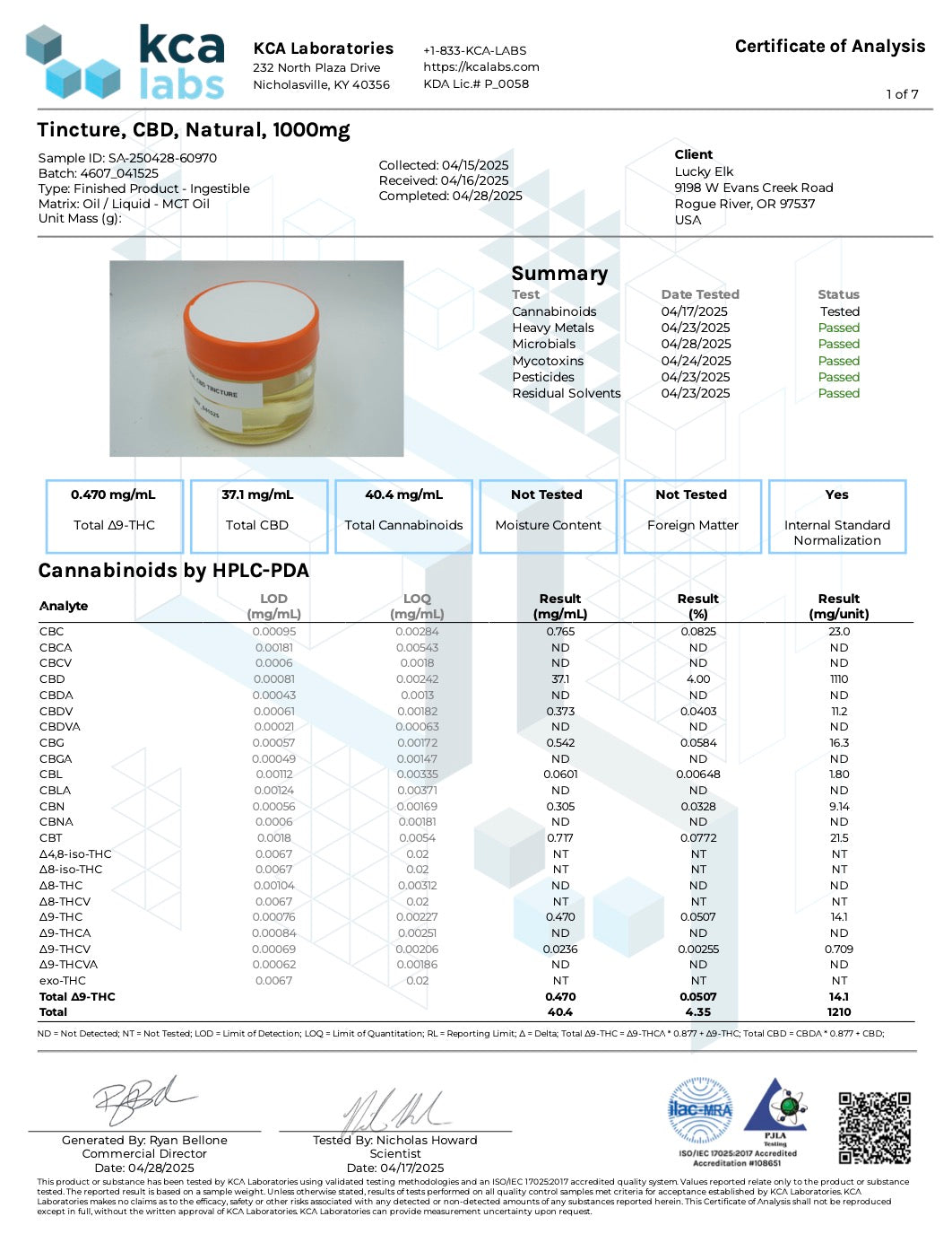 At Lucky Elk, our “tinctures” contain no ethanol whatsoever. That’s why we call them “CBD Drops” instead. The solvents have been completely removed from the CBD distillate—leaving behind only the plant’s full-spectrum of cannabinoids, along with a relatively small amount of natural terpenes and lipids. By mixing this potent brew with MCT oil, our laboratory partners dilute the overall percentage of THC to a non-psychoactive level—leaving our customers with a safe, legal, and highly effective method for self-care.
